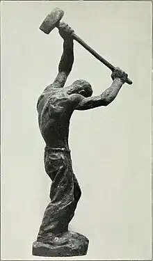 Although Mahonri Young was taught the classical style which prevailed in the French art institutes of the time, and was surrounded by colleagues who sought to reject the classical style with impressionistic and post-impressionistic styles, Young was disinterested in depicting idyllic or naturalistic images and was more concerned with depicting the realities of life that surrounded him.[109] Consequently, Young's work is often associated with social realism, as his work depicted laborers, immigrants, minorities, the West, and man's interaction with nature.[110] At the time, Young felt isolated by his traditionalist instructors and colleagues who penned Young's work as "dishonest".[111] The size of his work ranged from larger monuments to small sculptures which he typically did in the social realist style.[11] His most recurring subject matter included animals, Native Americans, the boxing ring, ranch life, and laborers.[112] Young greatly admired the work of Cyrus Dallin and Young's work often had parallels to that of Dallin's.[113]