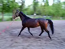 Malopolski horses generally stand from 15.3 to 16.2 hands (63 to 66 inches, 160 to 168 cm) high, and may be bay, black, chestnut, gray, or roan,[1] although chestnut and bay are the most common colors.[2] Their head is well proportioned with a straight profile, a neck of good length, withers prominent, the chest wide and deep, and the shoulder sloping and long. The back is long and the croup slightly sloping. The legs are well-muscled and long, with good joints and tough hooves. The breed has much in common with another Polish breed, the Wielkopolski. Malopolski horses are used for riding and light draft work. They are said to perform well in sporting competitions, especially show jumping.[1]