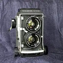 The Mamiya C220 is a lightweight twin-lens reflex camera made in the early 1970s by the Japanese camera manufacturer Mamiya. The camera has interchangeable lenses ranging from 55 mm wide-angle to 250 mm telephoto and accepts 120 and 220 rollfilms. The rack and pinion focusing system with a bellows makes it possible for close-up photography without attachments. The straight film path has no sharp turns for absolute flatness of the film.