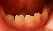 A mamelon (from French mamelon, "nipple") is one of three rounded protuberances which are present on the cutting edge of an incisor tooth when it first erupts through the gum. Mamelons' appearance can be smoothed by a dentist if they have not been worn down naturally by biting and eating foods.[1] Mamelons are present on permanent central and lateral incisors. Mamelons are easiest to observe on the maxillary central incisors, and appear as three small prominences on the incisal edge of the tooth. Mamelons are ordinarily of no clinical importance. Usually they are worn off early in the life of the tooth.