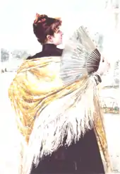 The Manila shawl (Spanish: mantón de Manila or mantón de seda) is an embroidered silk shawl derived from the Filipino pañuelo. They were popular in the Philippines, Latin America , and Spain during the colonial era. It also became popular in European fashions in the 19th century. In modern times, it is still an aspect of various traditional clothing in Hispanic cultures and is particularly prominent as part of the costume (traje de flamenca) of flamenco dancers (bailaoras) and Gitana women.[1]