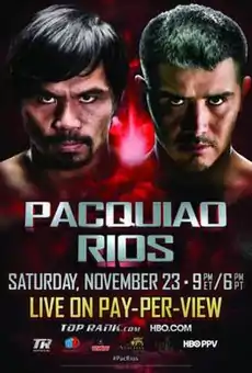 Manny Pacquiao vs. Brandon Ríos, billed as The Clash in Cotai, was a boxing welterweight championship fight for the vacant WBO International Welterweight championship. The bout was held on 24 November 2013 at the Venetian Macau resort & hotel in Macau.[1][2][3] Pacquiao won via unanimous decision and took the vacant WBO International welterweight title. Pacquiao said that the fight would be dedicated to the victims of the recent typhoon hit in the Philippines.[4][5][6] The fight drew 475,000 ppv buys.