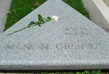Manon's half-sister, the sculptor Anna Mahler, produced a marker for her grave—a young woman holding an hourglass—but the Anschluss prevented it from being installed.[13] The statue was later destroyed in an air raid. Manon's grave lacked a permanent marker until the 1950s, when Walter Gropius designed the flat, triangular marker and landscaping.[7]