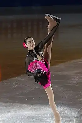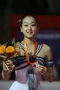 She is the former world record holder for the ladies' short program score, which she set at the 2014 World Championships and held until it was broken by Evgenia Medvedeva in 2016.[2] A former prodigy, Asada is the fifth woman and the first junior girl to land the triple Axel, accomplishing this at the 2004–05 Junior Grand Prix Final. She won her first Grand Prix Final at the age of 15. Considered by many to be the best figure skater in the world at that time, Asada was 87 days too young to compete at the 2006 Winter Olympics. She is the first figure skater in a singles discipline from Asia to win multiple world championships. At the 2013 Skate America, she became the first singles skater, male or female, to win all seven of the current events on the Grand Prix series.[3] She holds 15 Grand Prix series titles, the second-highest total among ladies and the sixth-highest total among skaters of all four disciplines.