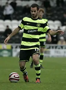 In August 2008, Crosas joined Celtic for a fee of £415,000 rising to £1.6 million depending on appearances, and signed a four-year contract.[6] Barcelona retained a £1.65 million buy-back option which took effect at the end of the 2009–10 season.[6] He was paraded at Celtic Park before the match with St Mirren. He made his debut for the first team as a substitute for Scott Brown against Falkirk at Celtic Park on 23 August 2008 and his first on 13 September against Motherwell at Fir Park. On 4 October, he was awarded man of the match for his performance against Hamilton Academical after completing his first full 90 minutes for Celtic. On 28 January 2009, Crosas scored in the penalty shootout of the Scottish League Cup semi-final against Dundee United. Celtic won the shootout 11–10.[7] On 28 February 2009, Crosas scored his first Celtic goal in a 7–0 home win against St Mirren; a powerful curving shot from 30 yards,[8] which was later voted Celtic's Goal of the Season. He was also voted Celtic's Young Player of the Season in his first season with the club.[9]