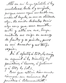 Del Pilar's last years in Spain saw his descent into extreme poverty. In a letter to his wife Marciana on August 17, 1892, he wrote: "For my meals, I have to approach friends for loans, day after day. To be able to smoke, I have gone to the extreme of picking up cigarette butts in the streets."[182][lower-alpha 25] In another letter to his wife on August 3, 1893, he told her about his frequent nightmares: "I always dream that I have Anita on my lap and Sofía by her side; that I kiss them by turns and that both tell me: 'Remain with us, papá, and don't return to Madrid'. I awake soaked in tears, and at this very moment that I write this, I cannot contain the tears that drop from my eyes."[182][16] In June 1893, del Pilar's relatives were able to send money so that he could return to the Philippines. However, his friends (Regidor, Torres, Blumentritt, Morayta, and Quiroga) advised him to stay in Spain. In a letter to his wife on December 21, 1893, he said: "I am afraid of being too hasty, because in view of my present situation, a wrong step on my part will injure many persons, and even if I should pass out of this life, my compatriots would continue to accuse me of imprudence. Note that an error of Rizal's did harm to many (the 1887 Calamba trouble)."[183][64]