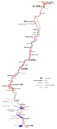 The mainline follows the Pielach valley through Hofstetten-Grünau, Rabenstein an der Pielach, the main center in the valley, Kirchberg an der Pielach, and on to the station at Loich, which was once of special importance to freight operations. The tunnel further along was built with only the railway's own loading gauge in mind, making freight transport by transporter wagons impossible. From here, the valley narrows considerably, and shortly before the next station, Schwarzenbach an der Pielach, the line passes through the Weißenburgtunnel, thereby leaving the Pielach valley and coming out into the Nattersbach valley, which narrows rather like a gorge. The line reaches first Frankenfels, and then the station at Laubenbachmühle.