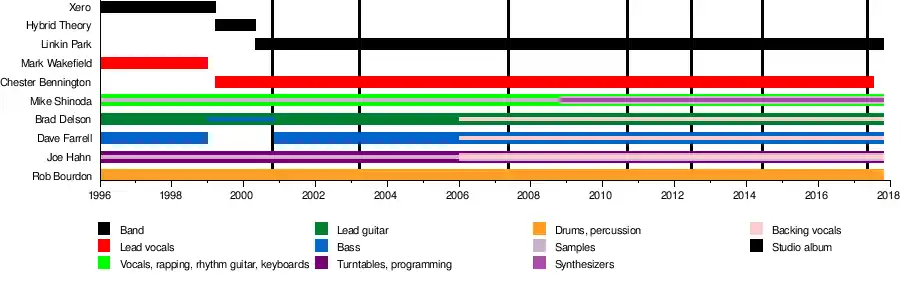 Linkin Park is an American rock band from Agoura Hills, California. The band's lineup comprises vocalist/rhythm guitarist/keyboardist Mike Shinoda, lead guitarist Brad Delson, bassist Dave Farrell, DJ/turntablist Joe Hahn and drummer Rob Bourdon, with vocalist Chester Bennington also part of the band until his death. Vocalist Mark Wakefield was an early member prior to Bennington's recruitment. Categorized as alternative rock, Linkin Park's earlier music spanned a fusion of heavy metal and hip hop, while their later music features more electronica and pop elements.