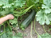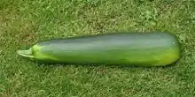 A marrow is the mature fruit of certain Cucurbita pepo cultivars used as a vegetable. The immature fruit of the same or similar cultivars is called courgette (in Britain, Iran, Ireland, France, the Netherlands, Singapore, Malaysia and New Zealand) or zucchini (in North America, Japan, Australia, the Czech Republic, Italy, Germany and Austria).[1] Like courgettes, marrows are oblong, green squash, but marrows have a firm rind and a neutral flavour ("overgrown when picked and insipid when cooked"),[1] making them useful as edible casings for mincemeat and other stuffings.[2] They can be stored for several weeks after harvest (like pumpkins and other winter squash), to be processed for food when required.[3] They are a vegetable used in Great Britain and areas with significant British influence, though their popularity is waning in favor of immature summer squash like courgette.[1]