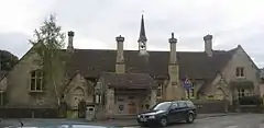 Almost every house along the high street is more than 100 years old, from the Georgian architecture Gothic toll house at the western end to the groups of medieval barn, dovecote, and early Georgian stable range which go with the manor house, which dates from the 17th century,[2] and Home Farm. Near the toll house stand the fine almshouses of 1612,[3] built for the use of eight elderly villagers by two sons of Marshfield, Nicholas and Ellis Crispe,[4] who had gone to London and made their fortunes largely through the West Indies trade. They endowed the houses with funds to provide a free residence, garden, and £11 yearly. Many houses date from Tudor era and Stuart times (a few were originally timber-framed) and have gables and mullioned windows. Several have bow fronts and there are five examples of shell-pattern door arches typical of Queen Anne work. The finest front in the high street is perhaps the Catherine Wheel some of whose buildings at the rear are much older than 1700.[5]