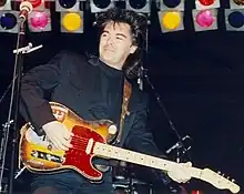 Stuart's guitars also include 'Clarence', the familiar two-tone Fender Telecaster, once owned by Clarence White. This instrument,[32][33] is the original B-Bender guitar, built by White and Gene Parsons around 1967, designed to allow the guitarist to manually raise the guitar's 'B' string one whole step to play in a style similar to a pedal steel guitar. Stuart bought this unique guitar in 1980 from White's widow.[34]