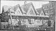 In September 1872, the B&P purchased a 6,221 square feet (577.9 m2) parcel at Camden Street from the Boston Water Power Company.[9][10] A station building was under construction by that November.[11][12] Chickering station, named for the nearby Chickering & Sons piano factory, opened in 1873.[13] The single-story brick structure was located on the south side of the tracks on the northeast side of Camden Street.[14][15] Chickering station was commonly used by baseball fans attending games at the South End Grounds.[16]