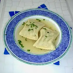 Maultaschen (singular Maultasche (ⓘ), lit. 'mouth bags') are a kind of large meat-filled dumpling in Swabian cuisine. They consist of sheets of pasta dough filled with minced meat, smoked meat, spinach, bread crumbs and onions and flavored with various herbs and spices (e.g. pepper, parsley and nutmeg). Maultaschen are typically 8–12 centimetres (3–4+1⁄2 inches) across. They are square or rectangular in shape.
