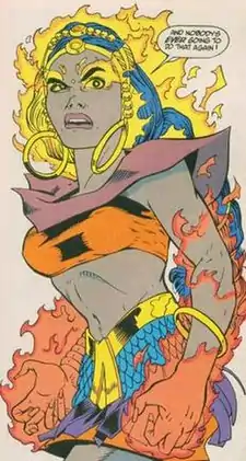 In London under the alias Maya, she witnesses the Justice League Europe brawl with the supervillain Sonar. She reluctantly uses her powers to assist them in their battle and manages to single-handedly defeat the threat. Grateful for her timely assistance, the JLE offers her official membership. Feeling she had nowhere else to go, she gladly accepts. One of her earliest missions with them involves a return to her homeland India, where she comes under attack from her supposed protector, the Mahayogi. Fortunately, she fends him off long enough to escape and rejoin her team.