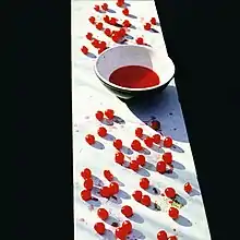 Set against a black background, the front cover image consisted of a bowl of cherry-red liquid placed on a cream-coloured wall and surrounded by loose red cherries, as if the fruit had been emptied from the bowl.[42] On the back cover, a photo taken by Linda in Scotland showed her husband with Mary tucked inside his fur-lined leather jacket.[57][58] Madinger and Easter comment that, unlike Lennon, McCartney did not feel the need to include his wife on the cover, and her back-cover photo was a "stunning" contribution from the former professional photographer.[23] In a 2013 news article recalling the album's release, the Philadelphia radio station WMMR described the photo of McCartney and his baby daughter as "iconic" and reflective of "his ultimate message: 'Home, family (and) love'."[59]