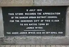 On the base of the clock, a black granite slab is engraved with the inscription "8 July 1915. This stone records the appreciation of the Bangor Urban District Council for the generous gift of this clock to his native town by James McKee. The above James McKee died on 28th April 1919".