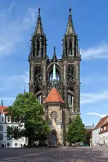 It was the episcopal see of the Bishopric of Meissen established by Emperor Otto I in 968. It replaced an older Romanesque church.[1] The present-day hall church was built between 1260 and 1410, the interior features Gothic sculptures of founder Emperor Otto and his wife Adelaide of Italy as well as paintings from the studio of Lucas Cranach the Elder. The first Saxon elector from the House of Wettin, Margrave Frederick I, had the Prince's Chapel erected in 1425 as the burial place of his dynasty. The twin steeples were not attached until 1909.