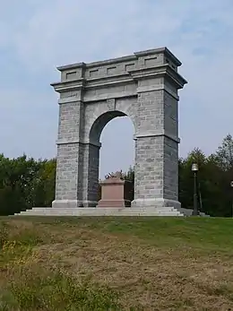 The Memorial Arch of Tilton is 55 feet (17 m) tall, 40 feet (12 m) wide, and is constructed of Concord granite. It sits atop a hill 150 feet (46 m) above the Winnipesaukee River, and its foundation goes into the earth 16 feet (4.9 m). At its base is a 50-ton sarcophagus and red granite "Numidian lion."[7] Tilton intended to be buried in this monument, but was not.[5] He was instead buried roughly a mile west, in Park Cemetery in Tilton.[2]
