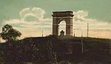Charles E. Tilton was inspired to create a triumphal arch in 1881, when he visited Rome. While there he saw the Arch of Titus and decided to create a similar structure in his town to "symbolize the victories of peace rather than those of war."[4] Ironically he chose to build this monument to peace on top of an old Indian fort at the apex of a local hill.[4]