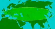 Its range spans from Europe to East Asia, but appears to be absent from the Iberian Peninsula.[12][13] It was predominantly present in Europe during interglacial periods where it formed part of the Palaeoloxodon antiquus assemblage, where it occurred alongside the straight-tusked elephant (Palaeoloxdon antquus) the narrow-nosed rhinoceros (Stephanorhinus hemitoechus), and the hippopotamus (Hippopotamus amphibius).[14] It is presumed to have had a preference for closed forest and woodland habitats, as opposed the to open grassland habitats favoured by S. hemitoechus.[14] Its range extended into the Arctic Circle, with a 70–48 thousand-year-old skull known from arctic Yakutia in the Chondon River valley[8] and a late Middle Pleistocene aged lower jaw from the Yana River valley.[15] Teeth are known from caves in Primorsky Krai , suggested to date between 50,000 and 25,000 years ago based on dates of other bones found in the deposit, which are the easternmost known records.[16] A tooth of S. cf. kirchbergensis of an unknown age is known from the Lut Desert in eastern Iran.[17] It is fairly common throughout the Pleistocene in North China,[18] but is a rarer component of South Chinese assemblages,[19] being known from around 30 localities in the region.[5] Antoine (2012) states that D. choukoutienensis, D. lantianensis, and D. yunchuchenensis are local names for the taxon, without elaboration.[18] Its range was strongly controlled by glacial cycles, with the species experiencing repeated cycles of expansion and contraction as the ice sheets advanced, this accounts for the relative rarity of its remains in comparison to the woolly rhinoceros.[12] The species' range underwent significant reduction during the Last Glacial Period, with the youngest records from Italy being in Marine isotope stage (MIS) 4 and 3.[20] Radiocarbon dated remains from the Altai date to around 40,000 years ago.[21] The youngest reliable records in China are from the Rhino Cave in Hubei, which is early Late Pleistocene in age.[19] Though less definitive remains are known from near Harbin in Heilongjiang, which are thought to be 20 kya in age.[5] Records from Migong Cave just south of the Yangtze River in the Three Gorges area are suggested to date to MIS 2 (29,000-14,000 years ago).[22]
