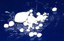 The name calomel is thought to come from the Greek καλός "beautiful", and μέλας "black"; or καλός and μέλι "honey" from its sweet taste.[4] The "black" name (somewhat surprising for a white compound) is probably due to its characteristic disproportionation reaction with ammonia, which gives a spectacular black coloration due to the finely dispersed metallic mercury formed. It is also referred to as the mineral horn quicksilver or horn mercury.[4]
