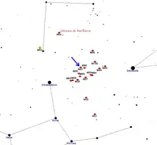 In 1969 Williams solved this lost Messier object by measuring its right ascension and declination relative to those of the nearby galaxy M89 (notable reference stars angularly nearby are sparse) – rather than M58, a 9th-magnitude galaxy which Messier recorded in 1778. This amended night sky "star-hopping" reference point matches Messier's figures[4] to 0.1 of an arcminute (′) in right ascension and 1′ in declination, a sixtieth of a degree.