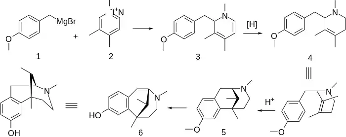 Thus, reaction of the Grignard reagent from p-methoxybenzyl chloride (1) with the lutidine methiodide (2) affords the benzylated dihydropyridine (3). Reduction of the enamine π-bond leads to the tetrahydropyridine (4). Cyclization by means of acid leads directly to the benzomorphan ring system (5). Demethylation of the aromatic ring system affords the phenol. Although this last compound is in fact a relatively potent analgesic, it is not available commercially as a drug.