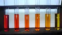 Methyl orange is a pH indicator frequently used in titration because of its clear and distinct color variance at different pH values. Methyl orange shows red color in acidic medium and yellow color in basic medium. Because it changes color at the pKa of a mid strength acid, it is usually used in titration of strong acids in weak bases that reach the equivalence point at a pH of 3.1-4.4.[3] Unlike a universal indicator, methyl orange does not have a full spectrum of color change, but it has a sharp end point. In a solution becoming less acidic, methyl orange changes from red to orange and, finally, to yellow—with the reverse process occurring in a solution of increasing acidity.
