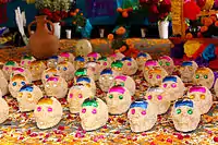 The Day of the Dead incorporates pre-Columbian beliefs with Christian elements. The holiday focuses on gatherings of family and friends to pray for and remember friends and family members who have died. An idea behind this day suggests the living must attend to the dead so that the dead will protect the living.[23] The celebration occurs on November 2 in connection with the Catholic holidays of All Saints' Day (November 1) and All Souls' Day (November 2). Traditions connected with the holiday include building private altars honoring the deceased, using sugar skulls, marigolds, and the favorite foods and beverages of the departed, and visiting graves with these as gifts. The gifts presented turn the graveyard from a dull and sorrowful place to an intimate and hospitable environment to celebrate the dead.[23]