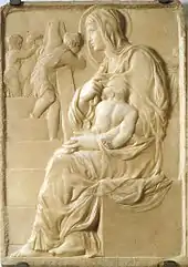 The Madonna of the Stairs is Michelangelo's earliest known work in marble. It is carved in shallow relief, a technique often employed by the master-sculptor of the early 15th century, Donatello, and others such as Desiderio da Settignano.[98] While the Madonna is in profile, the easiest aspect for a shallow relief, the child displays a twisting motion that was to become characteristic of Michelangelo's work. The Taddei Tondo of 1502 shows the Christ Child frightened by a Bullfinch, a symbol of the Crucifixion.[45] The lively form of the child was later adapted by Raphael in the Bridgewater Madonna. The Madonna of Bruges was, at the time of its creation, unlike other such statues depicting the Virgin proudly presenting her son. Here, the Christ Child, restrained by his mother's clasping hand, is about to step off into the world.[99] The Doni Tondo, depicting the Holy Family, has elements of all three previous works: the frieze of figures in the background has the appearance of a low-relief, while the circular shape and dynamic forms echo the Taddeo Tondo. The twisting motion present in the Madonna of Bruges is accentuated in the painting. The painting heralds the forms, movement and colour that Michelangelo was to employ on the ceiling of the Sistine Chapel.[45]