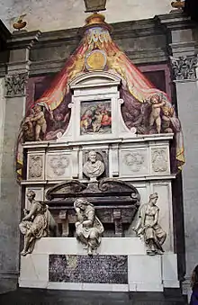 In 1520, the Medici came back to Michelangelo with another grand proposal, this time for a family funerary chapel in the Basilica of San Lorenzo.[53] For posterity, this project, occupying the artist for much of the 1520s and 1530s, was more fully realised. Michelangelo used his own discretion to create the composition of the Medici Chapel, which houses the large tombs of two of the younger members of the Medici family, Giuliano, Duke of Nemours, and Lorenzo, his nephew. It also serves to commemorate their more famous predecessors, Lorenzo the Magnificent and his brother Giuliano, who are buried nearby. The tombs display statues of the two Medici and allegorical figures representing Night and Day, and Dusk and Dawn. The chapel also contains Michelangelo's Medici Madonna.[61] In 1976, a concealed corridor was discovered with drawings on the walls that related to the chapel itself.[62][63]