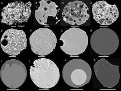 Micrometeorite (MM) textures vary as their original structural and mineral compositions are modified by the degree of heating that they experience entering the atmosphere—a function of their initial speed and angle of entry. They range from unmelted particles that retain their original mineralogy (Fig. 1 a, b), to partially melted particles (Fig. 1 c, d) to round melted cosmic spherules (Fig. 1 e, f, g, h, Fig. 2) some of which have lost a large portion of their mass through vaporization (Fig. 1 i). Classification is based on composition and degree of heating.[5][6]