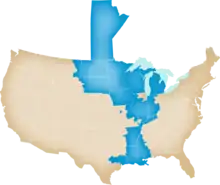 The Midcontinent Independent System Operator, Inc., formerly named Midwest Independent Transmission System Operator, Inc. (MISO)[4] is an Independent System Operator (ISO) and Regional Transmission Organization (RTO) providing open-access transmission service and monitoring the high-voltage transmission system in the Midwest United States and Manitoba, Canada and a southern United States region which includes much of Arkansas, Mississippi, and Louisiana. MISO also operates one of the world's largest real-time energy markets.[5][6] The 15 states covered by MISO are: Arkansas, Illinois, Indiana, Iowa, Kentucky, Louisiana, Michigan, Minnesota, Mississippi, Missouri, Montana, North Dakota, South Dakota, Texas, and Wisconsin.[7]