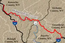 The Midland Trail is a National Scenic Byway which carries U.S. Route 60 (US 60) through a portion of the southern part of the U.S. state of West Virginia between Charleston and Sam Black Church. It was part of the longer transcontinental Midland Trail.