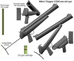 The Milkor Stopper is a riot gun used for riot control, designed to fire a 37/38mm or 40mm cartridge, which can be a 9mm Buckshot, Rubber ball buckshot, teargas canister, rubber shot cartridge or explosive. The weapon is simple to operate and all metal surfaces are treated with a coating for corrosion protection, plus long-life dry film lubrication. It fires one shot before reloading. It is a conventional single shot, break-open weapon (opening at the breech like an ordinary shotguns (not pump-action)) with a floating firing pin mechanism that ensures safety when accidentally dropped. As a security or assault weapon, it can be fired from the shoulder or like a pistol by hand. The components of the weapon are interchangeable (client dependent), providing a range of applications from Less Lethal 37/38mm to a 40mm Lethal weapon.