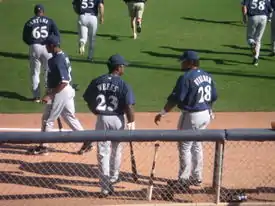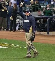 The Brewers have retired five uniform numbers in honor of former players and team personnel.[29] This ensures that the number will be associated with one person of particular importance to the team. Additionally, the number 42 has been retired throughout professional baseball in honor of Jackie Robinson.[30] Though not retired, the number 17 has not been issued since Jim Gantner's retirement in 1992.[31] Gantner, however, later wore the number from 1996 to 1997 when he returned as the Brewers' first base coach.