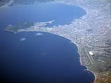 Mount Hakodate was originally an island that was formed by volcanic eruptions millions of years ago.[9] During the course of history a sand bar formed between Mount Hakodate and the peninsula.[9] This landform, which is an example of a tombolo, finished forming in circa 1000 BCE.[9] The tombolo connects the former Hakodate island with the main island Hokkaido to the north.[9] The main central area of Hakodate city is located on the sandbar.[9]