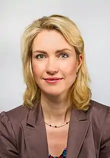 The current and first female Minister-President is Manuela Schwesig, since 2021 heading a coalition government between the Social Democrats and The Left.[1] Schwesig succeeded Erwin Sellering in July 2017.