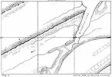 Most of the copper mining was still done in open pit mining, but two shafts, one over 300 feet, were also sunk at the mine.[5] In 1875, more than 50 people were working at the Minong Mine and living in the nearby settlement of Cove, at the end of McCargoe Cove.[5] Later, at the height of the Minong operation, some 150 miners were employed at the mine.[11] A railroad ran between the mine proper and Cove, and the mining settlement had a post office, a dam, a stamp mill (built in 1876), a dock, and a blacksmith's shop.[5][7][11]