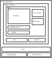 A Mojito application is a set of mojits facilitated by configurable JSON files which define the code for model, view and controller. This MVC structure works with API block and Mojito services, and can be deployed at both client and server side. While the application is deployed at client side, it can call server-side modules using binders. Binders are mojit codes that let mojits request services from each other. Mojit Proxy acts as an intermediary between binders and mojit's API (application context) block and other mojits.