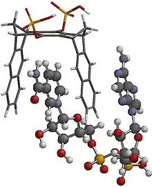 Water-soluble phosphate-substituted molecular tweezers made of alternating phenyl and norbornenyl substituents bind to positively charged aliphatic side chains of basic amino acids, such as lysine and arginine (Figure 3).[11][12] Similar compounds called "molecular clips", whose side walls are flat rather than convex, prefer to enclose flat pyridinium rings (for example the nicotinamide ring of NAD(P)+) between their plane naphthalene sidewalls (Figure 4).[13] These mutually exclusive binding modes make these compounds valuable tools for probing critical biological interactions of basic amino acid side chains in peptides and proteins as well as of NAD(P)+ and similar cofactors. For example, both types of compounds inhibit the oxidation reactions of ethanol by alcohol dehydrogenase or of glucose-6-phosphate by glucose-6-phosphate dehydrogenase,[14] respectively.