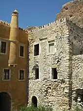At the highest point of the rock of Monemvasia was the acropolis. This fortress consisted of an enclosure with four towers at each corner. Entrance was made through a gate in the eastern wall. The walls were made of 'mudstone' with a fortified mortar. In the place of the southwestern tower, a rectangular powder magazine was built during the second Venetian period. Remains of buildings are preserved inside the fort. One of the buildings near the center had a cistern. There are indications that on the eastern side of the fort there was a large hall, on the southern wall of which the monogram of Theodore Palaiologos was found. The fortress seems to have been abandoned during the first Venetian rule.[13]