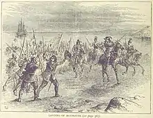 Over the next couple of days volunteers arrived in Lyme offering to serve under Monmouth. By 15 June he had a force in excess of 1,000 men.[36] On 13 June he lost two of his leading supporters when Dare and Fletcher disputed who should ride one of the best horses provided by local supporters. Fletcher shot and killed Dare and was then put under arrest and sent back to the frigate Helderenberg.[37] The next day, 40 cavalry and 400 foot soldiers, under the command of Lord Grey and Wade, moved on to the nearby town of Bridport, where they encountered 1,200 men from the local royalist Dorset militia.[38] The skirmish ended in a Royalist victory, with the retreat of Grey and the cavalry followed by Wade with the foot soldiers.[39] Many of the militiamen deserted and joined Monmouth's army.[40] Following this confrontation, Lord Albemarle led a royalist force from Exeter towards the forces of the Duke of Somerset, who were approaching Lyme Regis from the opposite direction.[41]