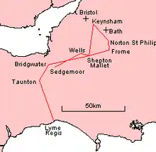 The rebels planned to go next to Warminster, where there were many nonconformist wool workers, but on 27 June the Wiltshire Militia had marched from Bath to Trowbridge, and on 29 June entered Westbury. Hearing that an army supporting him had gathered near Bridgwater, Monmouth turned back through Shepton Mallet and arrived in Wells on 1 July.[65] His men damaged the Bishop's Palace and the west front of Wells Cathedral, tearing lead from the roof to make bullets, breaking the windows, smashing the organ and the furnishings, and for a time stabling their horses in the nave.[66]