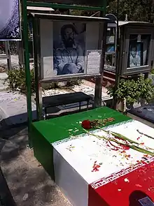 Chamran led an infantry unit during the Iran–Iraq War and received two wounds in his left leg by shrapnel from a mortar shell.[8] However, he refused to leave his unit.[8] He was killed in Dehlavieh on 21 June 1981 as the war was raging on.[3][27][28][29][30] His death was regarded as "suspicious" and the related details have remained unclear.[19][31][32] Chamran was buried in the Behesht-e Zahra cemetery in Tehran.[8]