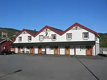 A motel, also known as a motor hotel, motor inn or motor lodge, is a hotel designed for motorists, usually having each room entered directly from the parking area for motor vehicles rather than through a central lobby. Entering dictionaries after World War II, the word motel, coined as a portmanteau of "motor hotel", originates from the Milestone Mo-Tel of San Luis Obispo, California (now called the Motel Inn of San Luis Obispo), which was built in 1925.[1][2] The term referred to a type of hotel consisting of a single building of connected rooms whose doors faced a parking lot and in some circumstances, a common area or a series of small cabins with common parking. Motels are often individually owned, though motel chains do exist.