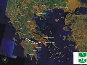 The Greek Motorway 8 (Greek: Αυτοκινητόδρομος 8), is a motorway in Greece. Part of the Olympia Odos network, the motorway connects Athens with Patras in southwestern Greece, spanning a total of 215 km (134 mi).