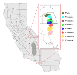 | M. sequoia[lower-alpha 1] | (Chamberlin, 1941) | East Fork of the Kaweah River, Tulare Co. | Originally described as Xystocheir sequoia. |