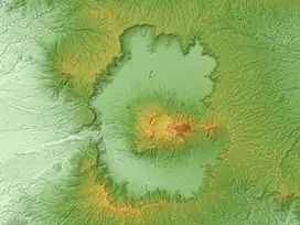 The present Aso Caldera formed as a result of four huge caldera eruptions occurring over a range of 90,000–300,000 years ago.[6] The caldera, one of the largest in the world, contains the city of Aso as well as Takamori and Minamiaso enclosing the caldera extends about 18 km east to west and about 25 km north to south. Viewpoints from the somma overlooking the caldera are perched upon lava formed before the volcanic activity which created the present caldera. Ejecta from the huge caldera eruption 90,800 years ago covers more than 600 km3 and roughly equals the volume of Mount Fuji; with a pyroclastic flow plateau that covered a significant part of Kyushu.