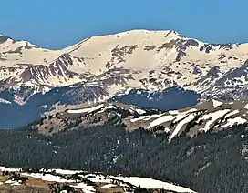 Mount Cumulus is situated on the Continental Divide along the boundary shared by Grand County and Jackson County.[5] It is the fourth-highest peak of the Never Summer Mountains which are a subrange of the Rocky Mountains.[6] The mountain is situated on the western boundary of Rocky Mountain National Park and is visible from Trail Ridge Road within the park. The west side of the peak is in the Never Summer Wilderness, on land managed by Medicine Bow–Routt National Forest. Precipitation runoff from the mountain's west slope drains into headwaters of the South Fork Michigan River and the east slope drains into the Colorado River except a portion which is diverted by the Grand Ditch. The counterintuitive direction of water flow is because the Continental Divide forms a loop in this area, whereby the peak's west slope runoff flows to the Atlantic Ocean and the east slope to the Pacific. Topographic relief is significant as the summit rises 3,700 feet (1,100 meters) above the Kawuneeche Valley in three miles (4.8 km) and over 2,300 feet (700 meters) above the South Fork Michigan River in one mile (1.6 km).